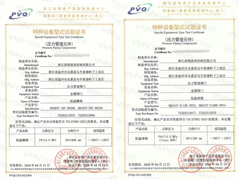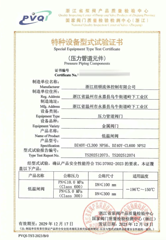 纽顿最终获得的特种设备型式试验证书由国家市场监督管理总局发放,是国内低温阀门市场准入的核心权威资质。